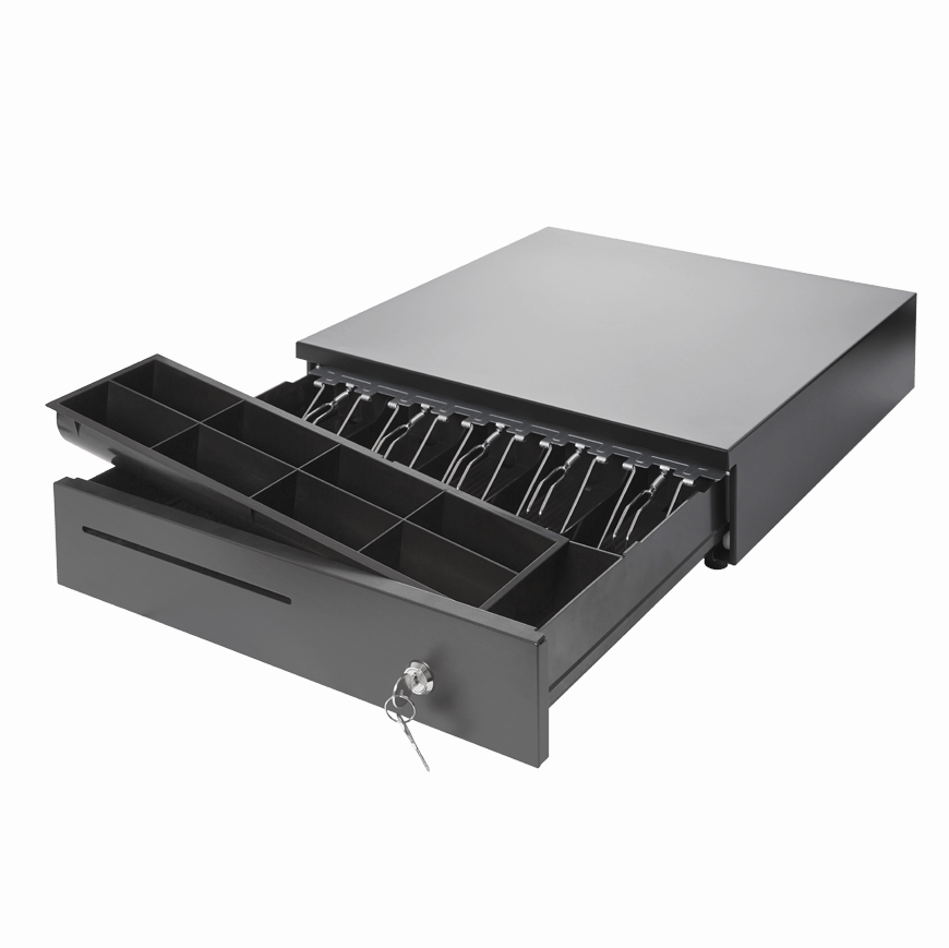Электромеханический денежный ящик G-Sense 410XL с горизонтальным выдвижным лотком. Стандартный размер ящика (408x420x100 мм) упрощает комплектацию кассовой зоны в магазинах и заведениях любого формата.